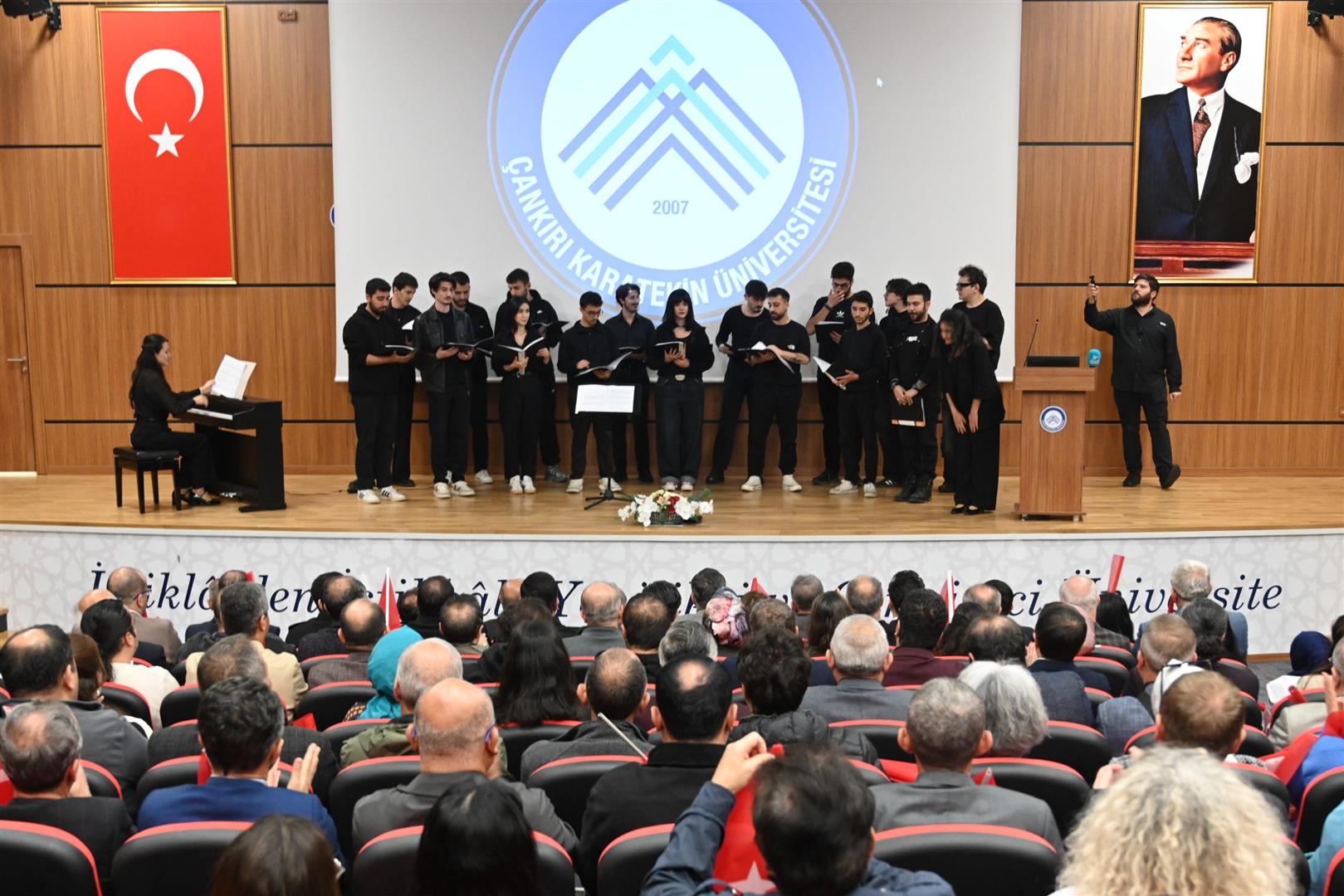 Türkiye Cumhuriyeti’nin 102. Yılı kutlamaları kapsamında üniversitemizde gerçekleştirilen etkinliğin açılışında Müzik Bölümü öğrencilerinden oluşan koro, performans sergiledi.  Öğr. Gör. Dr. Yağmur Yaşar’ın şefliğini ve Doç. Dr. Tuğba Çağlak Eker’in piyano eşliklerini yaptığı koro; Ahmet Adnan Saygun, Faik Canselen, Musa Süreyya, Osman Zeki Üngör gibi tanınmış Türk bestecilerinin marşlarını seslendirdi.